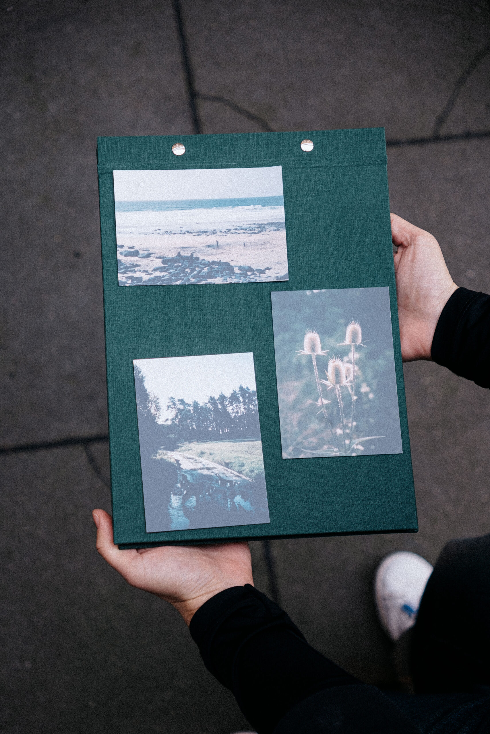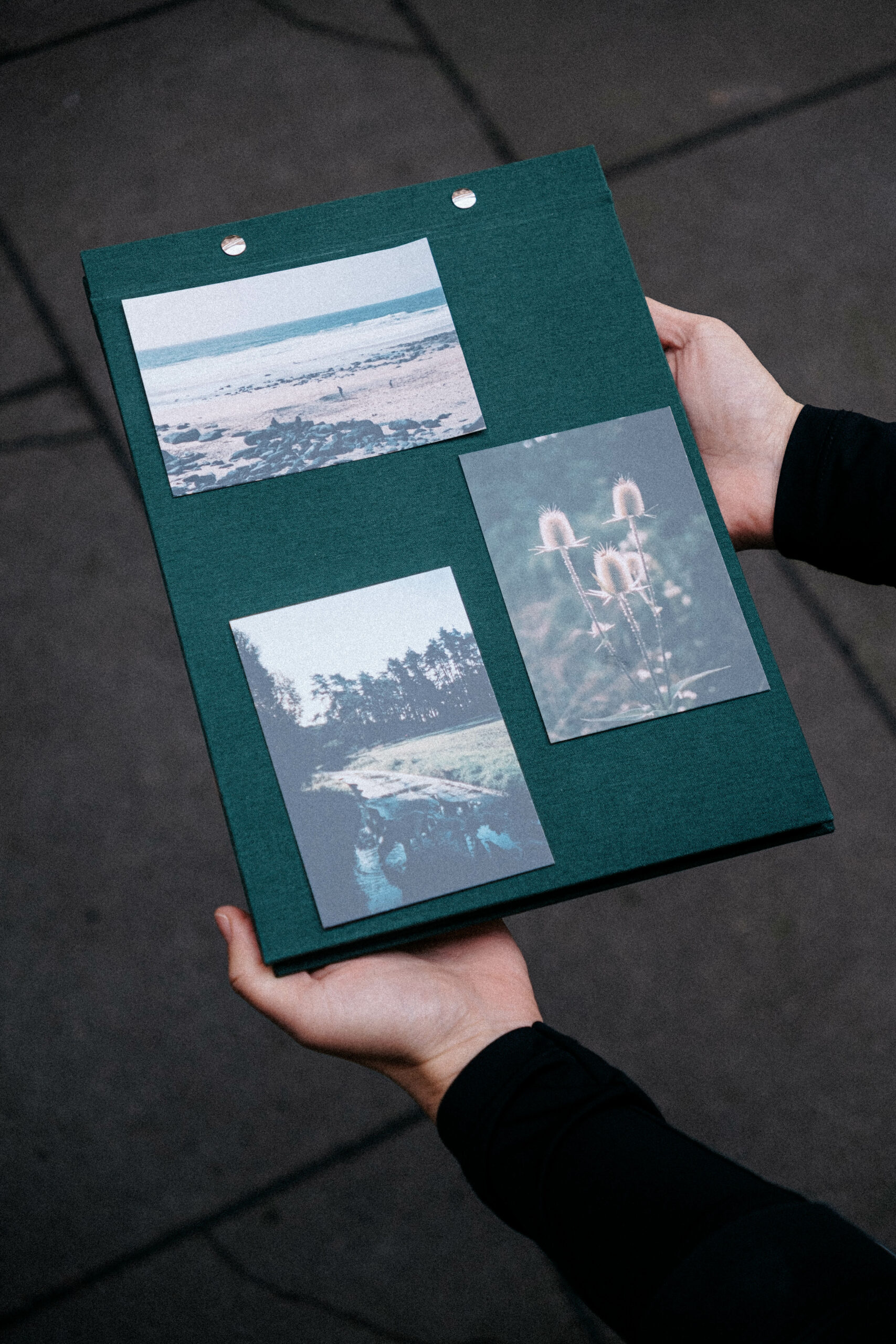 Má desky pokryté kvalitním textilem v tmavě zelené barvě a obsahuje 20 černých listů oddělených tenkým pavučinovým papírem, tak jak jsme byli zvyklí u alb z našeho dětství. Vazbu jsme vymysleli tak, aby album drželo otevřené a neohýbalo se, ale aby zároveň vypadalo elegantně.
